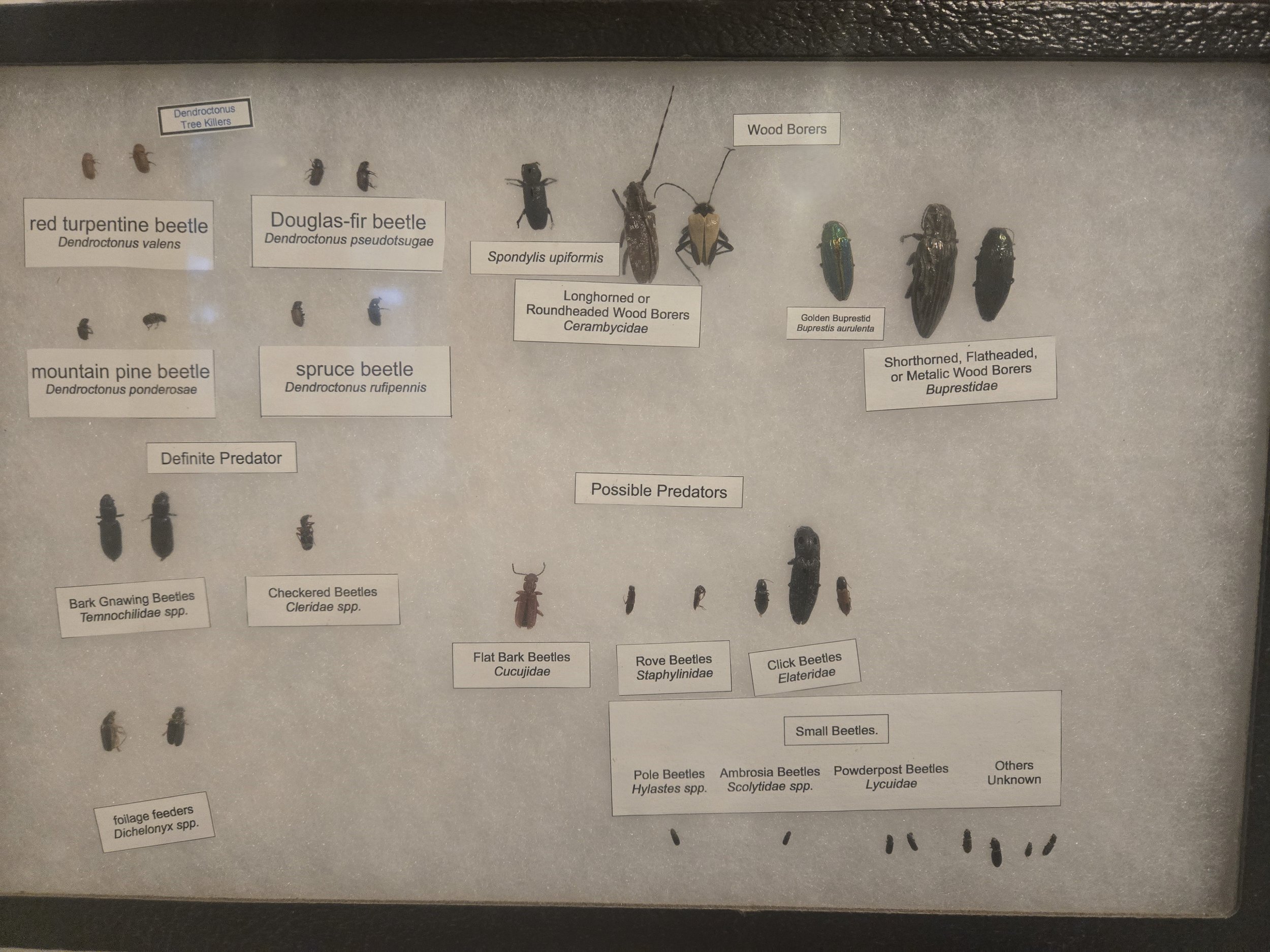 The following insect mounts display the variety and diversity of insect populations moving through the bark beetle ecosystem in a temperate forest environment.
